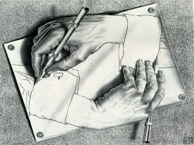 Love this image AND the notion of co-drawing sharpening the hands out of preliminary sketches. The sense of mutualism is wonderfully rendered. An intuition from Active Inference that is the initial prediction of a hand (rough outline) could synchronize into a different pattern e.g. "misshapen hands” rather than the pattern of more textured, realistic ones. In other words, feedback loops can persist in beautiful or non-beautiful loops of mutualism